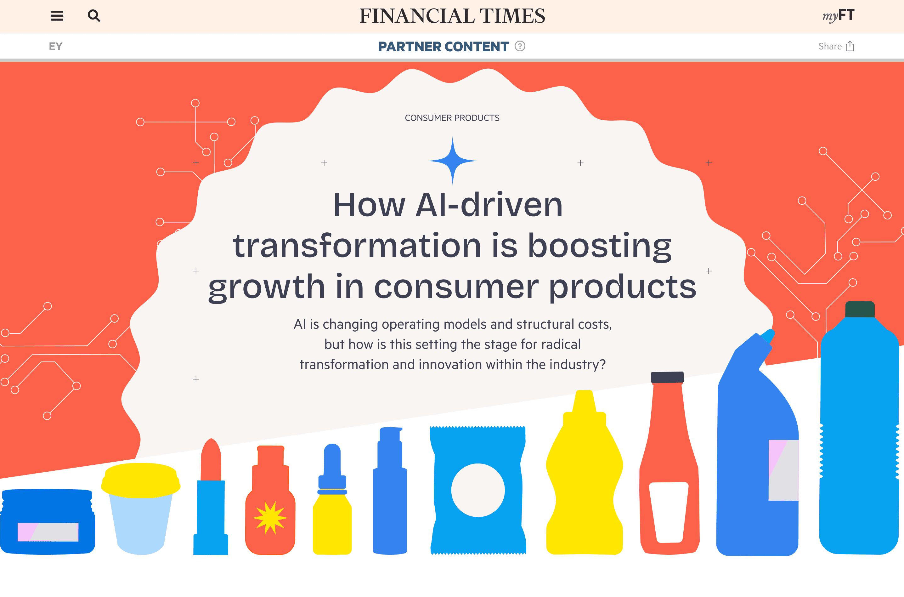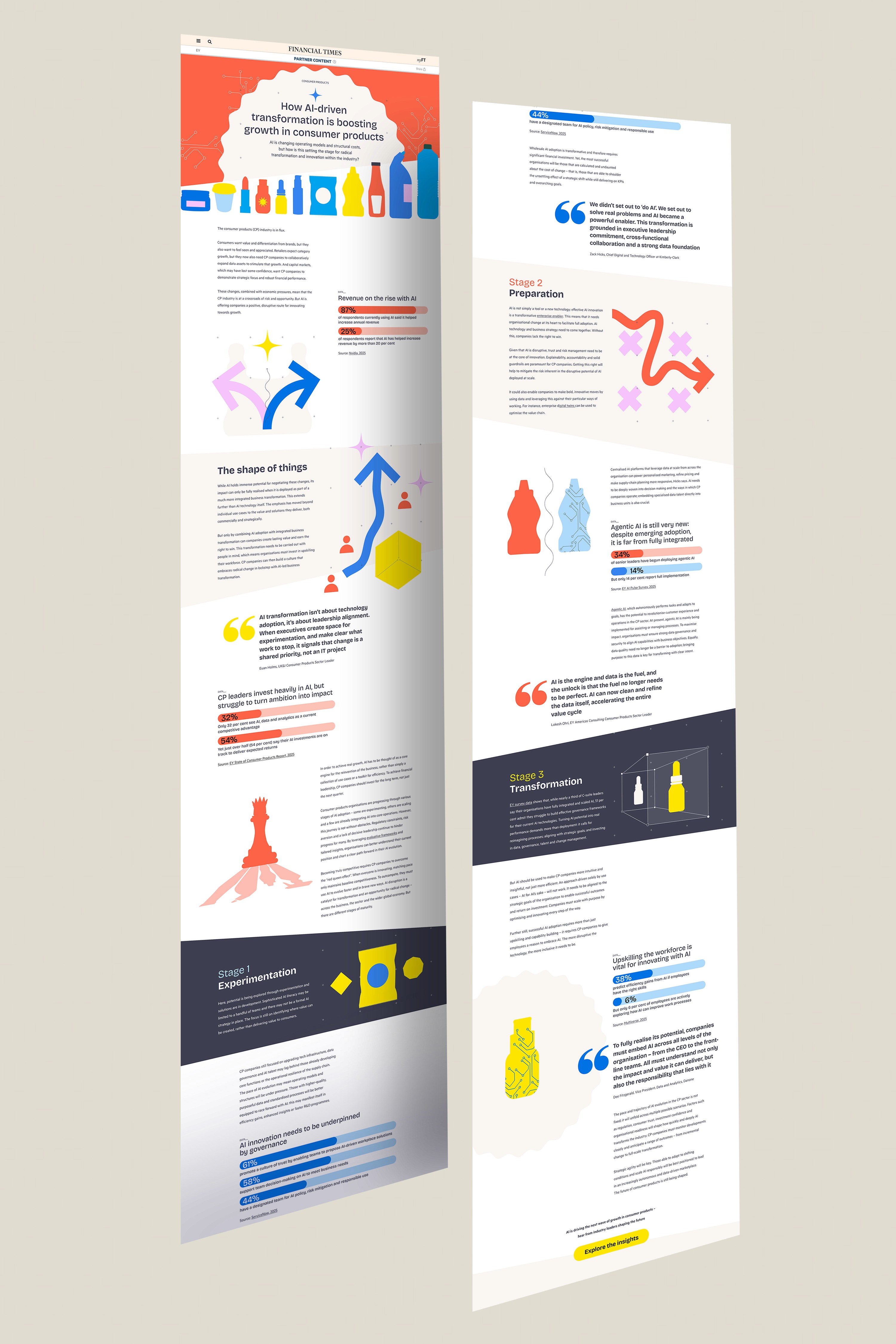With this article series, EY set out to highlight the growing role of AI and data analytics in shaping the future of consumer product markets. As the consumer products industry undergoes rapid transformation, understanding and embracing these technologies has become essential. I led the design from concept through to delivery, developing a suite of bold, vibrant illustrations that reframe AI and data analytics as dynamic and playful tools for curious minds. The visual language sparks imagination and encourages experimentation. Bright, energetic shapes reinforce a sense of discovery, positioning the campaign as human, approachable and empowering. The user is invited to explore new possibilities with AI, turning innovation into an engaging and accessible experience. ______ TEAM Executive Producer: Nellie deGoguel · Digital Editor and Writer: Enis Yucekoralp · Art Director and Illustrator: Natalie Kaaserer