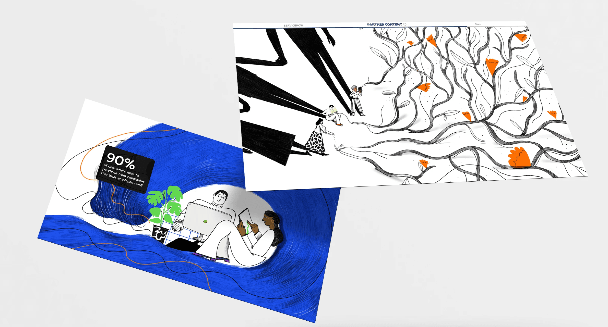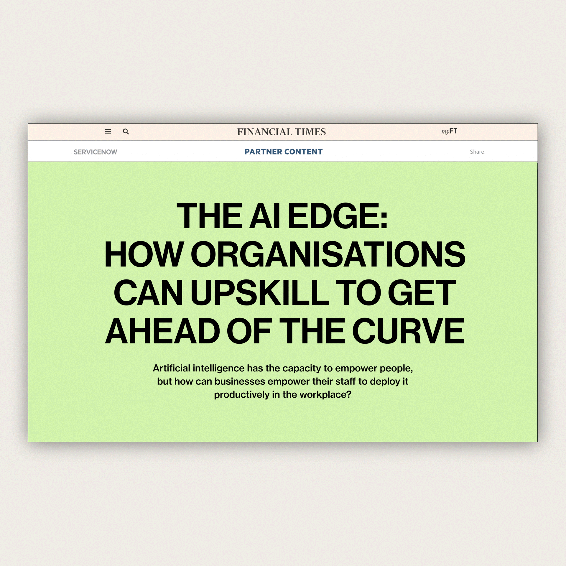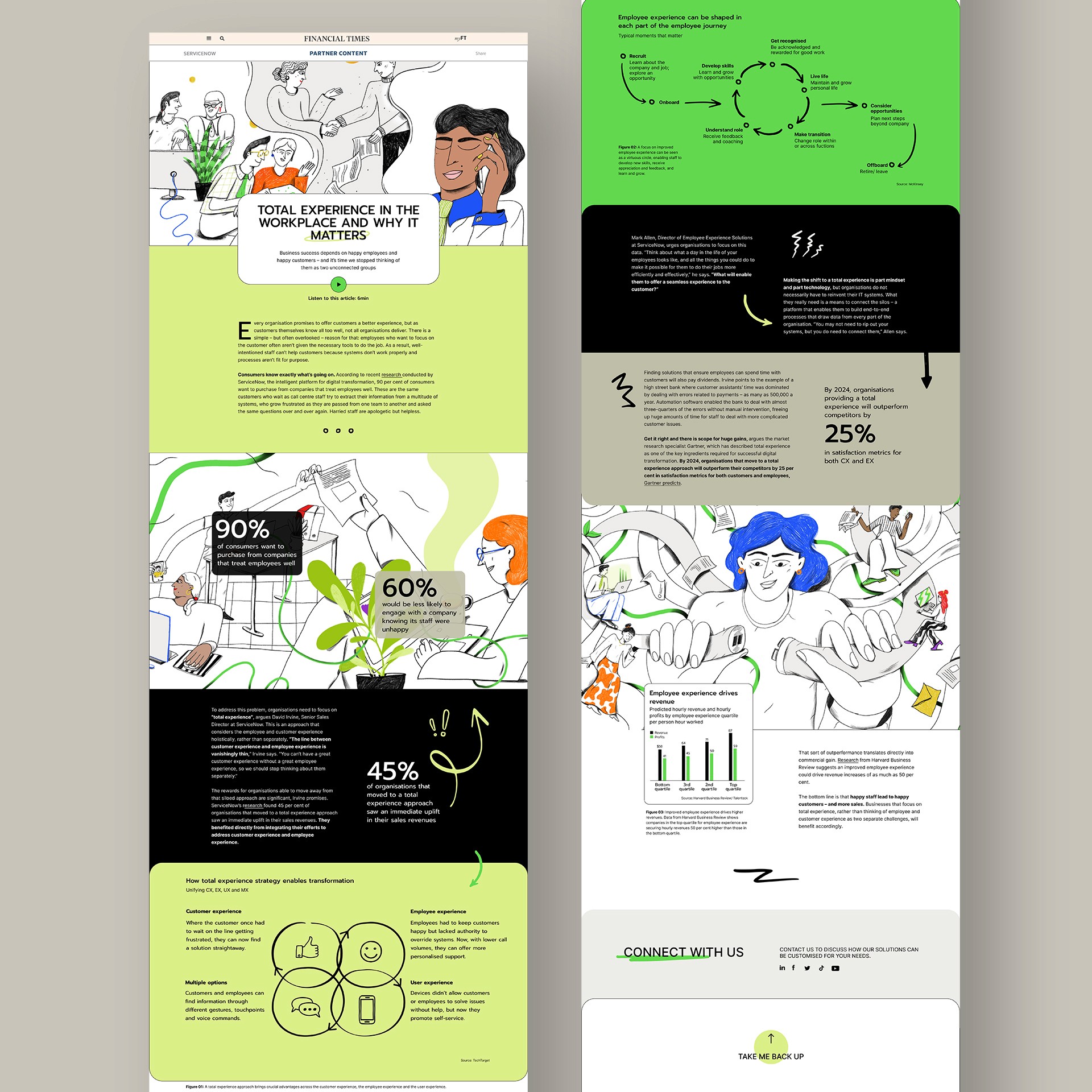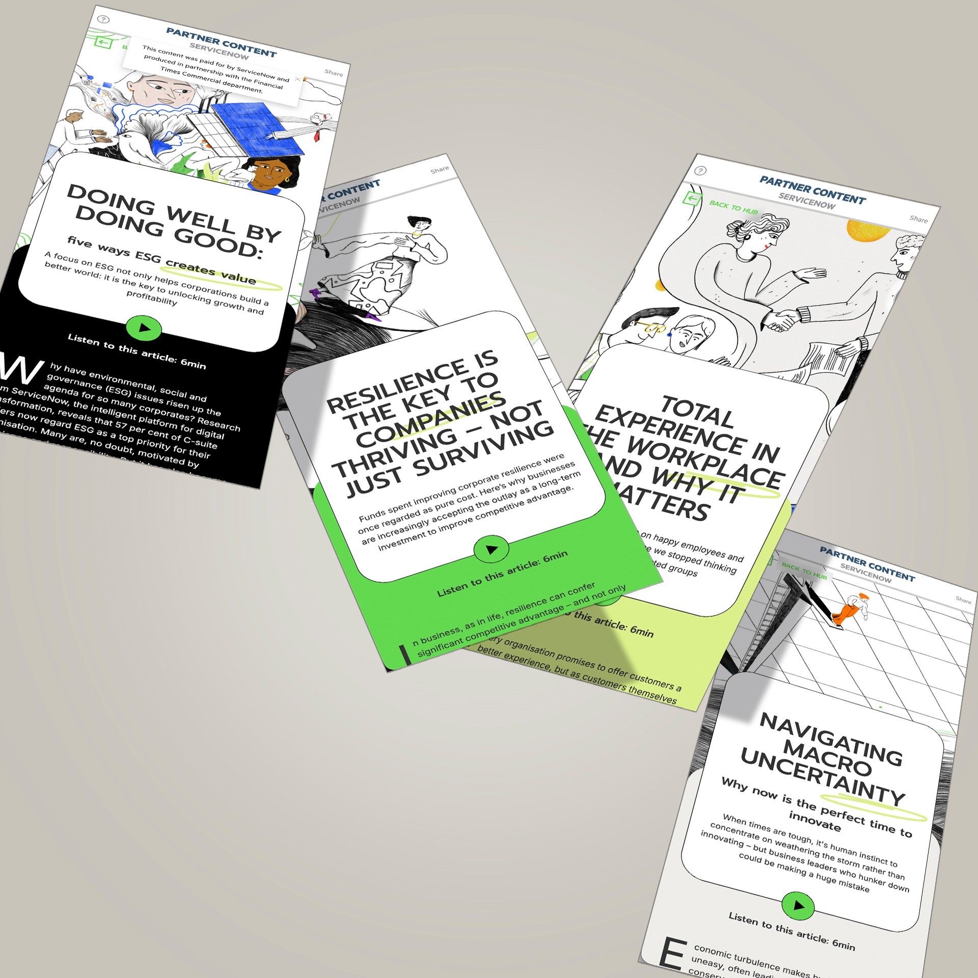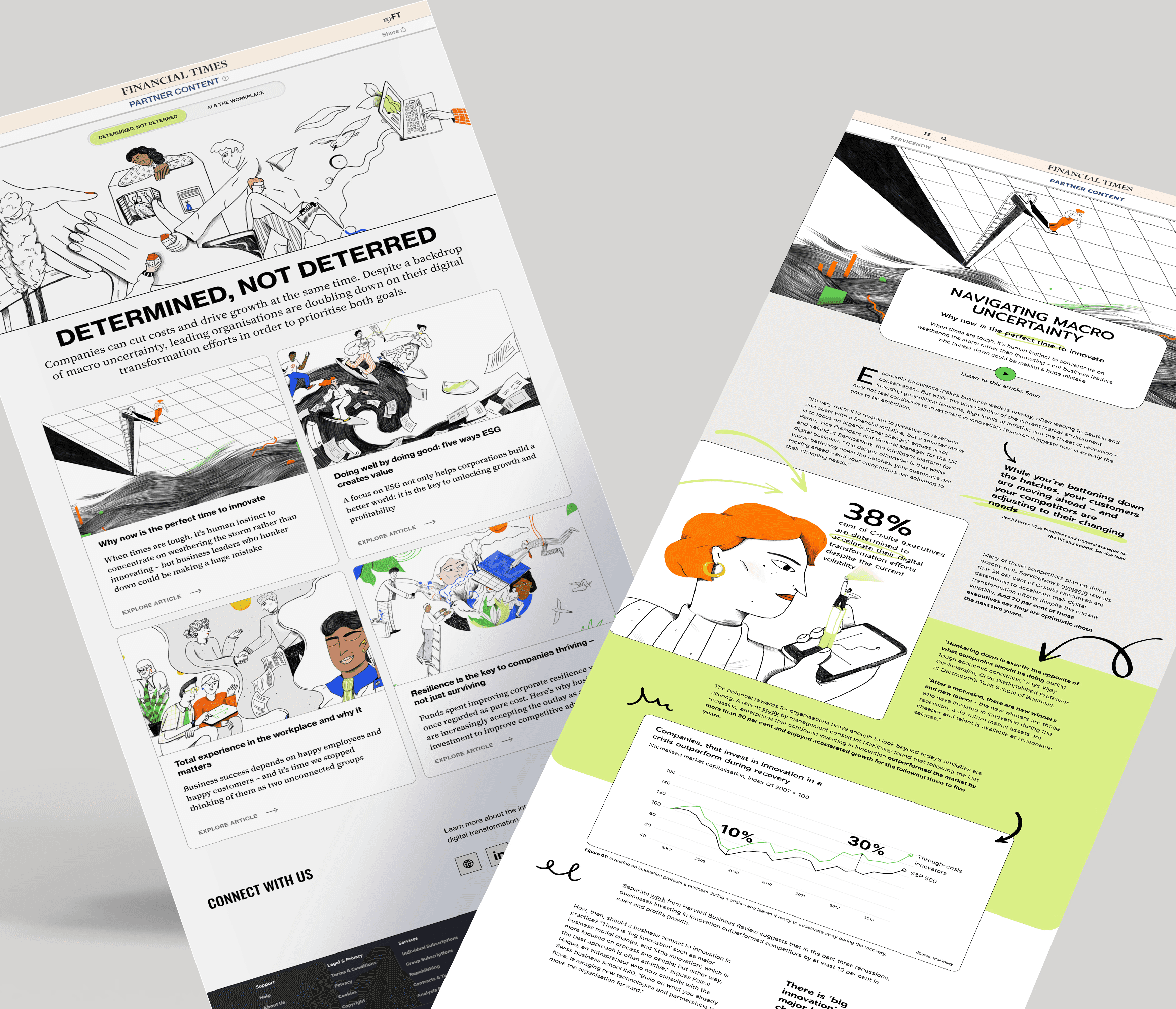 The FT has partnered with Service Now for several years to deliver a dedicated content partner hub to explore how digital transformation, big data and AI are reshaping business and society. Working closely with the team at FT Studio, I designed a series of immersive digital articles across two consecutive years. The first instalment delivered a rich narrative scrolling experience, interspersed with data visualisations and editorial illustrations by Hungarian illustrator Hanna Tintor. The visual approach balanced clarity and depth, helping to translate complex AI themes into engaging and accessible storytelling. The following year, the series adopted a lighter, more humorous tone. Featuring the simple, expressive style of UK illustrator Ryan Gillet, the art direction brought warmth and wit to the subject of AI, humanising the technology and making it feel more relatable. This instalment also incorporated interactive polls throughout the articles, encouraging reader participation and deepening engagement. ___ Illustrations by Hanna Tintor and Ryan Gillet